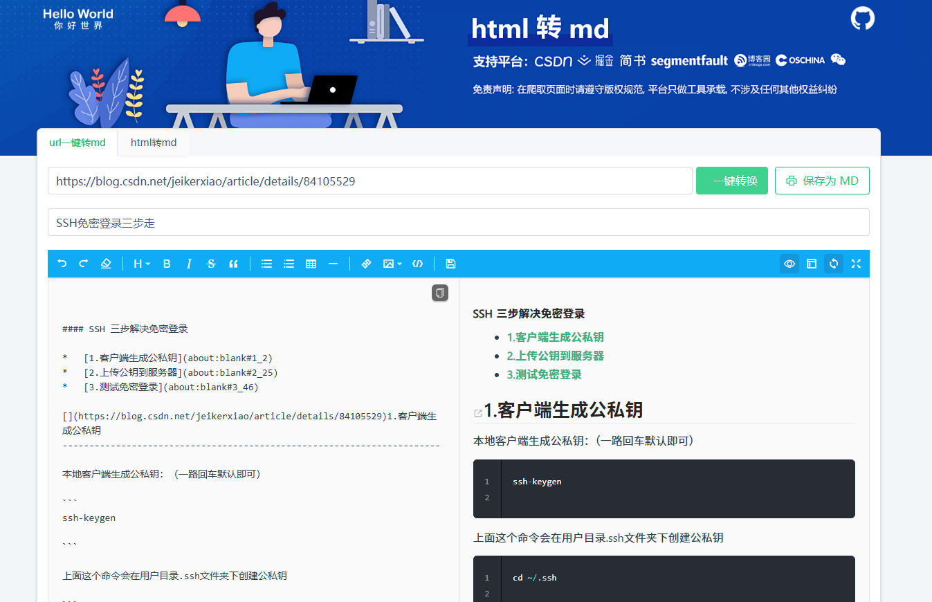 在线地址:https://www.helloworld.net/html2md