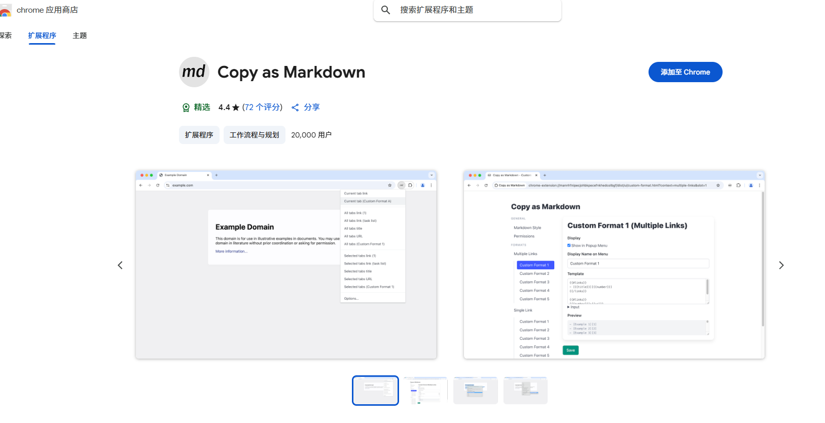 Copy as Markdown 是一个 Chrome 扩展程序,可以帮助您将以下内容作为 Markdown 复制到系统剪贴板: - 当前选项卡作为链接 - 页面上的链接 - 如果链接中包含图像,复制的 Markdown 将采用该图像作为链接文本。 - 页面上的图像 - 所有选项卡作为链接列表 - 选择链接列表的选项卡 您还可以自定义键盘快捷键,无需单击鼠标即可复制选项卡的链接。 - 已知问题 - 复制图像时无法抓取 image.alt - 在 Microsoft Windows 上,复制的页面链接不附带链接标题