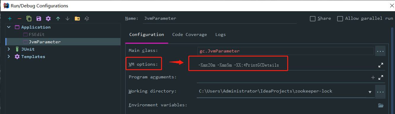 1 | -Xmx20m -Xms5m -XX:+PrintGCDetails |